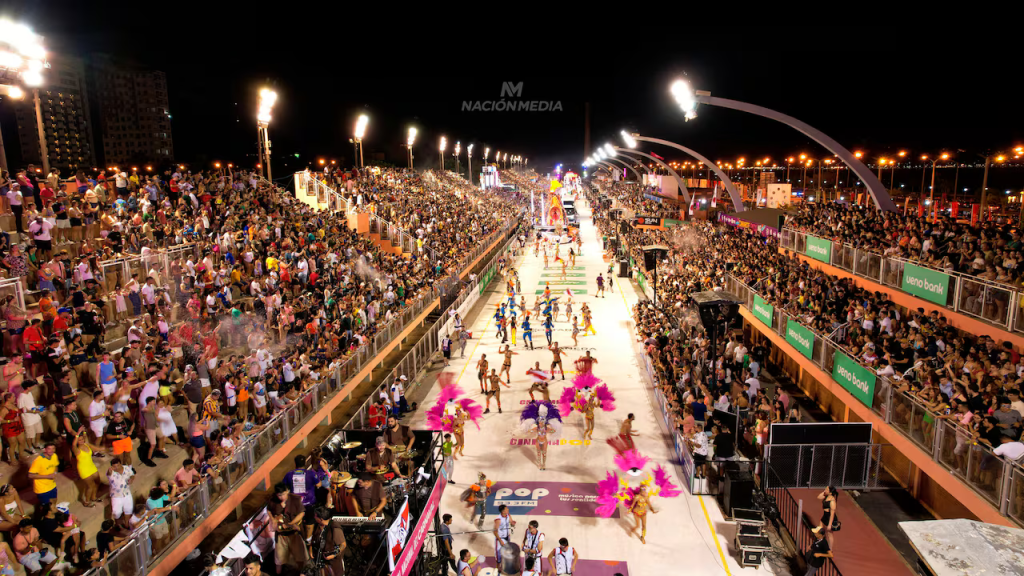 El carnaval paraguayo tiene su epicentro en la ciudad de Encarnación, conocida como la «Capital del Carnaval». Esta celebración es la más grande del país y ocurre durante los sábados de enero y febrero en un sambódromo masivo. El estilo es muy similar al de Río de Janeiro, con imponentes clubes compitiendo con lujosos trajes de plumas y lentejuelas, coreografías complejas y carrozas monumentales que desfilan ante miles de personas.